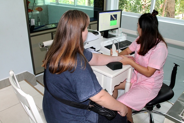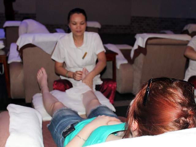 Массаж стоп по точкам-ретрансляторам внутренних органов. Бывает и щекотно и больно, - в зависимости от состояния здоровья.