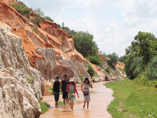 Сама по себе прогулка по Suoi Tien – успокаивающее и расслабляющее путешествие, позволяющее увидеть много красивого на своем пути. На одном берегу – кокосовые рощи, лужайки с полевыми цветами, деревья сакуры, лайма и грейпфрута. На другой стороне – золотые, красные и белые песчаные склоны. Под ногами – проточная вода, ярко желтый песок и черные частички полезного ископаемого под названием титан ильменит. Прогуляться по такой мелкой, теплой реке приятно и полезно, ведь титан ильменит активно используют не только в промышленности, но и в индустрии красоты, как нам рассказали гиды.