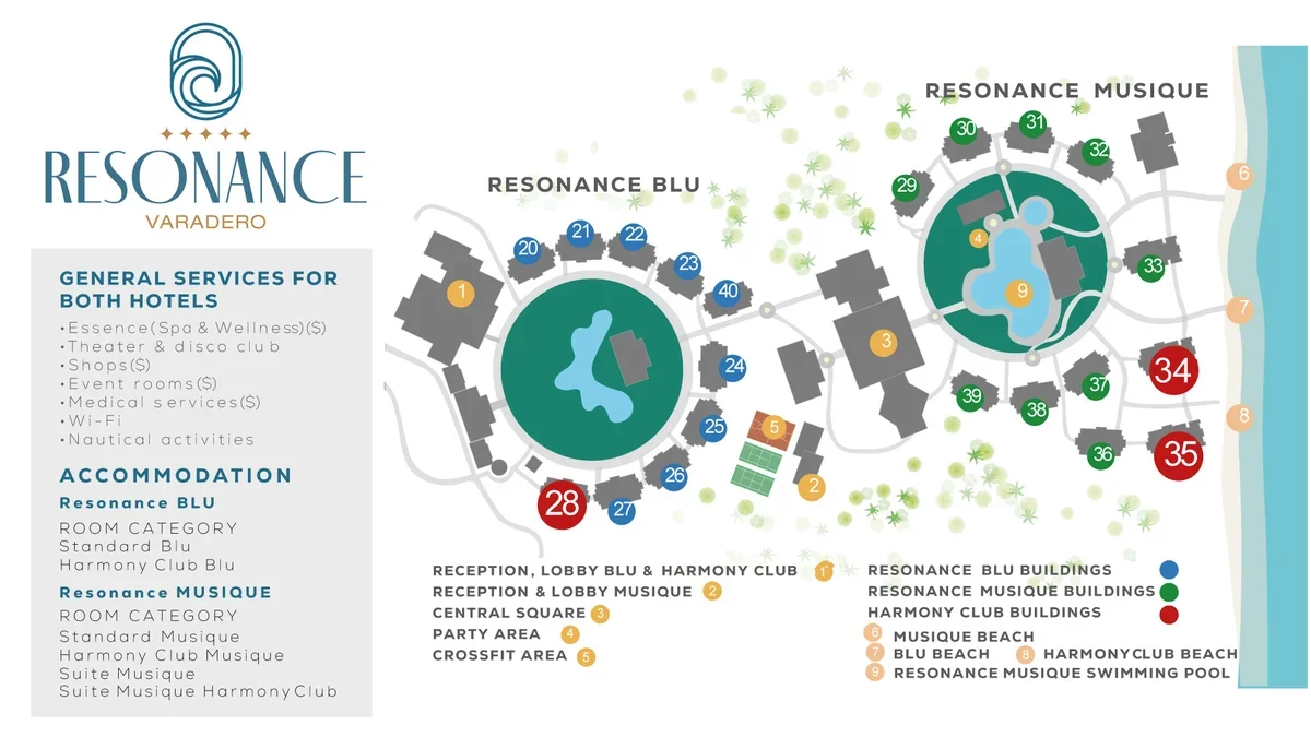 Независимо от того, в каком из двух Resonance остановятся туристы – в Resonance Musique 4* или Resonance Blu 4*, в концепцию их отеля будут включены разнообразный «шведский стол», SPA, фитнес и wellness, магазины, шикарный пляж, бассейны, шезлонги, немоторизованные водные виды спорта, бесплатный Wi-Fi. На территории отелей есть медицинский кабинет, конференц-залы и пункт обмена валюты.